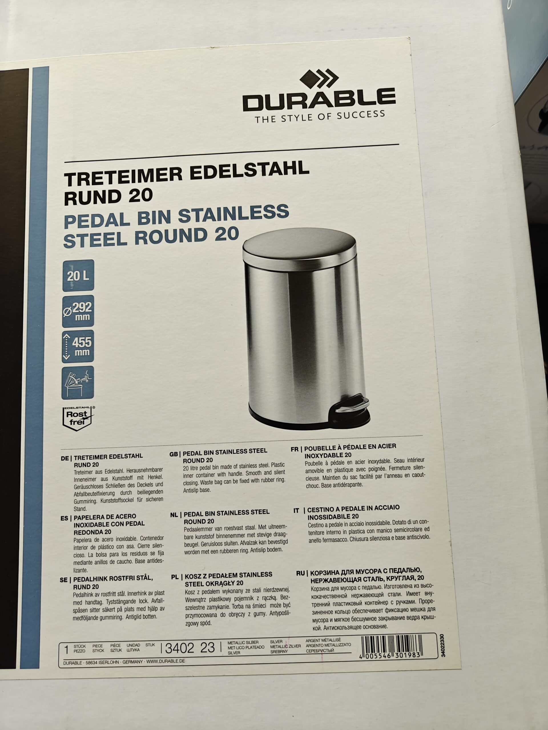 Poubelle DURABLE en acier inoxydable 20L à pédale